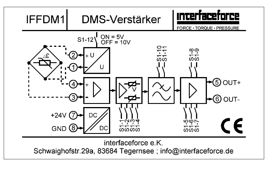 Die Geräte der Kraftmessverstärker Serie IFFDM1 dienen zum Anschluss an DMS-Vollbrücken mit Sensitivitäten von 0,2mV/V bis 50mV/V und setzen deren Signal in ein Normsignal 0…±10V, 0…±20mA oder 4…20mA um. Es können Messbrücken mit einem Brückenwiderstand ≥120Ω verwendet werden. Das Parallelschalten mehrerer Brücken ist möglich, solange der Gesamtwiderstand von 120Ω nicht unterschritten wird. Durch den bipolaren Ausgang können sowohl Druck, als auch Zugkräfte gemessen werden. Die Brückenspeisespannung ist über Dip-Schalter zwischen 10V und 5V umschaltbar. Zum Abgleich des Nullpunktes, sowie des Endbereiches stehen dem Anwender je ein 20-Gang Spindelpotentiometer für die Einstellung grob und fein zur Verfügung. Zusätzlich kann über 4 Dip-Schalter die sehr grobe Verstärkung vor eingestellt werden. Die Auswahl des Ausgangssignal, sowie dessen Übertagungsfrequenz erfolgt ebenfalls über Dip-Schalter. Das Modell IFFDM2 ist ein vergleichbares Modell jedoch in DIN Hutschienen-Ausführung und 6-Leiter-Technik